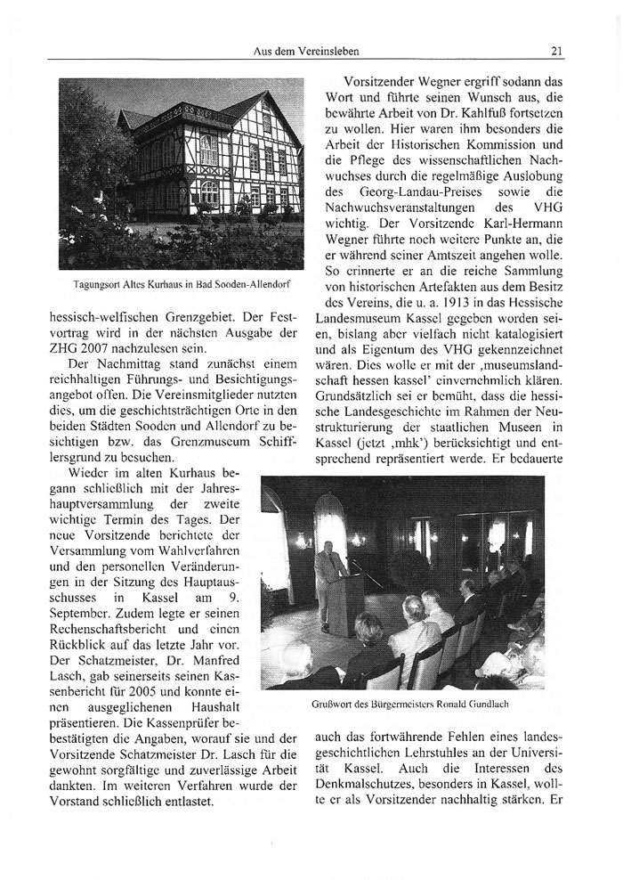 Wieder im alten Kurhaus begann schließlich mit der Jahreshauptversammlung der zweite wichtige Termin des Tages. Der neue Vorsitzende berichtete der Versammlung vom Wahlverfahren und den personellen Veränderungen in der Sitzung des Hauptausschusses in Kassel am 9. September. Zudem legte er seinen Rechenschaftsbericht und einen Rückblick auf das letzte Jahr vor. Der Schatzmeister, Dr. Manfred Lasch, gab seinerseits seinen Kassenbericht für 2005 und konnte einen ausgeglichenen Haushalt präsentieren. Die Kassenprüfer be