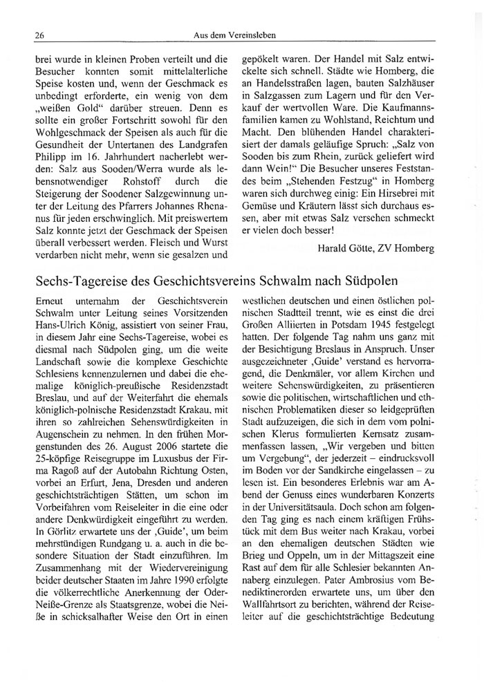 Erneut unternahm der Geschichtsverein Schwalm unter Leitung seines Vorsitzenden Hans-Ulrich König, assistiert von seiner Frau, in diesem Jahr eine Sechs-Tagereise, wobei es diesmal nach Südpolen ging, um die weite Landschaft sowie die komplexe Geschichte Schlesiens kennenzulernen und dabei die ehemalige königlich-preußische Residenzstadt Breslau, und auf der Weiterfahrt die ehemals königlich-polnische Residenzstadt Krakau, mit ihren so zahlreichen Sehenswürdigkeiten in Augenschein zu nehmen. In den frühen Morgenstunden des 26. August 2006 startete die 25-köpfige Reisegruppe im Luxusbus der Firma Ragoß auf der Autobahn Richtung Osten, vorbei an Erfurt, Jena, Dresden und anderen geschichtsträchtigen Stätten, um schon im Vorbeifahren vom Reiseleiter in die eine oder andere Denkwürdigkeit eingeführt zu werden. In Görlitz erwartete uns der ,Guide', um beim mehrstündigen Rundgang u. a. auch in die besondere Situation der Stadt einzuführen. Im Zusammenhang mit der Wiedervereinigung beider deutscher Staaten im Jahre 1990 erfolgte die völkerrechtliche Anerkennung der OderNeiße-Grenze als Staatsgrenze, wobei die Neiße in schicksalhafter Weise den Ort in einen
