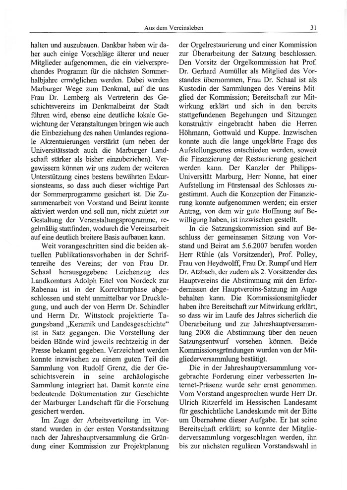 der Orgelrestaurierung und einer Kommission zur Überarbeitung der Satzung beschlossen. Den Vorsitz der Orgelkommission hat Prof. Dr. Gerhard Aumüller als Mitglied des Vorstandes übernommen, Frau Dr. Schaal ist als Kustodin der Sammlungen des Vereins Mitglied der Kommission, Bereitschaft zur Mitwirkung erklärt und sich in den bereits stattgefundenen Begehungen und Sitzungen konstruktiv eingebracht haben die Herren Höhmann, Gottwald und Kuppe. Inzwischen konnte auch die lange ungeklärte Frage des Aufstellungsortes entschieden werden, soweit die Finanzierung der Restaurierung gesichert werden kann. Der Kanzler der PhilippsUniversität Marburg, Herr Nonne, hat einer Aufstellung im Fürstensaal des Schlosses zugestimmt. Auch die Konzeption der Finanzierung konnte aufgenommen werden, ein erster Antrag, von dem wir gute Hoffnung auf Bewilligung haben, ist inzwischen gestellt.