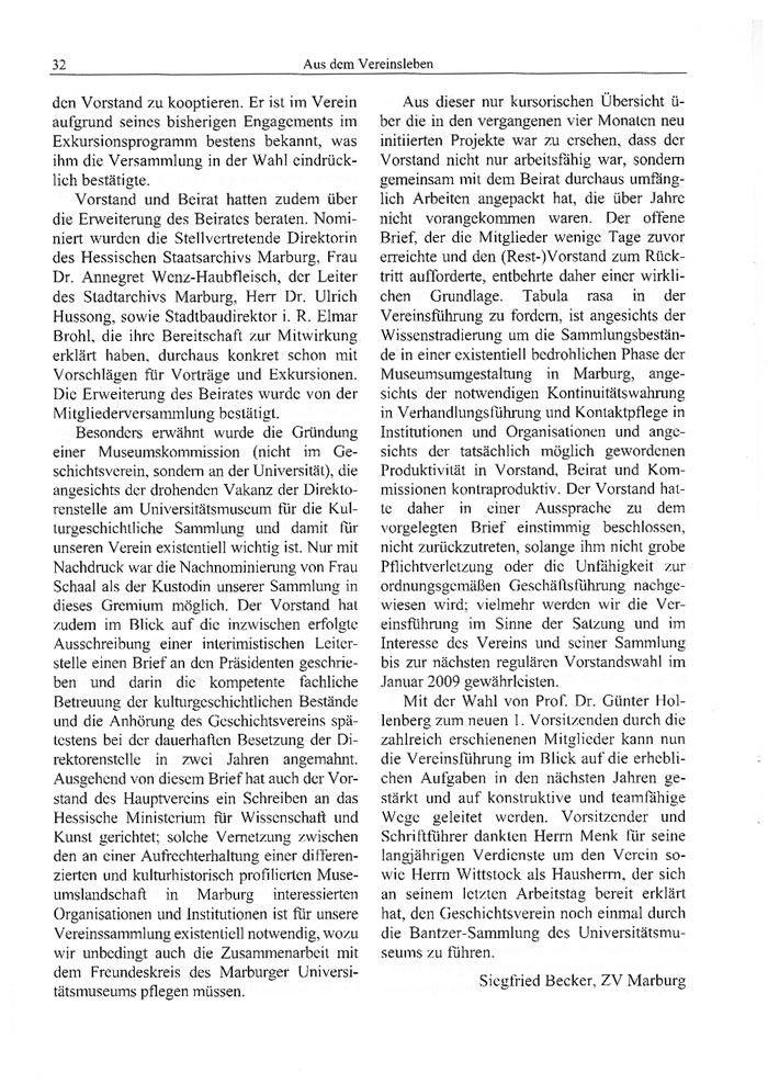 Aus dieser nur kursorischen Übersicht über die in den vergangenen vier Monaten neu initiierten Projekte war zu ersehen, dass der Vorstand nicht nur arbeitsfähig war, sondern gemeinsam mit dem Beirat durchaus umfänglich Arbeiten angepackt hat, die über Jahre nicht vorangekommen waren. Der offene Brief, der die Mitglieder wenige Tage zuvor erreichte und den (Rest-)Vorstand zum Rücktritt aufforderte, entbehrte daher einer wirklichen Grundlage. Tabula rasa in der Vereinsführung zu fordern, ist angesichts der Wissenstradierung um die Sammlungsbestände in einer existentiell bedrohlichen Phase der Museumsumgestaltung in Marburg, angesichts der notwendigen Kontinuitätswahrung in Verhandlungsführung und Kontaktpflege in Institutionen und Organisationen und angesichts der tatsächlich möglich gewordenen Produktivität in Vorstand, Beirat und Kommissionen kontraproduktiv. Der Vorstand hatte daher in einer Aussprache zu dem vorgelegten Brief einstimmig beschlossen, nicht zurückzutreten, solange ihm nicht grobe Pflichtverletzung oder die Unfähigkeit zur ordnungsgemäßen Geschäftsführung nachgewiesen wird, vielmehr werden wir die Vereinsführung im Sinne der Satzung und im Interesse des Vereins und seiner Sammlung bis zur nächsten regulären Vorstandswahl im Januar 2009 gewährleisten.