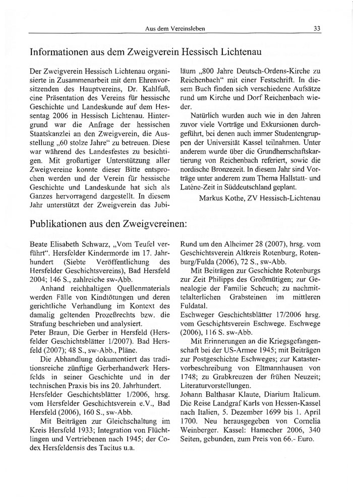 Der Zweigverein Hessisch Lichtenau organisierte in Zusammenarbeit mit dem Ehrenvorsitzenden des Hauptvereins, Dr. Kahlfuß, eine Präsentation des Vereins für hessische Geschichte und Landeskunde auf dem Hessentag 2006 in Hessisch Lichtenau. Hintergrund war die Anfrage der hessischen Staatskanzlei an den Zweigverein, die Ausstellung „60 stolze Jahre" zu betreuen. Diese war während des Landesfestes zu besichtigen. Mit großartiger Unterstützung aller Zweigvereine konnte dieser Bitte entsprochen werden und der Verein für hessische Geschichte und Landeskunde hat sich als Ganzes hervorragend dargestellt. In diesem Jahr unterstützt der Zweigverein das Jubiläum „800 Jahre Deutsch-Ordens-Kirche zu Reichenbach" mit einer Festschrift. In diesem Buch finden sich verschiedene Aufsätze rund um Kirche und Dorf Reichenbach wieder.