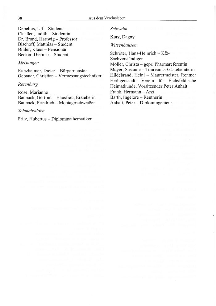 Möller, Christa - gepr. Pharmareferentin Mayer, Susanne - Tourismus-Gästeberaterin Hildebrand, Heini - Maurermeister, Rentner Heiligenstadt: Verein für Eichsfeldische Heimatkunde, Vorsitzender Peter Anhalt Frank, Hermann - Arzt