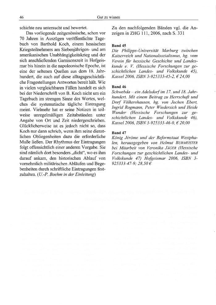 Das vorliegende zeitgenössische, schon vor 70 Jahren in Auszügen veröffentlichte Tagebuch von Barthold Koch, einem hessischen Kriegsteilnehmers am Siebenjährigen- und am amerikanischen Unabhängigkeitskrieg und der sich anschließenden Gamisonszeit in Hofgeismar bis hinein in die napoleonische Epoche, ist eine der seltenen Quellen aus dem 18. Jahrhundert, die auch auf diese alltagsgeschichtliche Fragestellungen Antworten bereit hält. Wie in vielen vergleichbaren Fällen handelt es sich bei der Niederschrift von B. Koch nicht um ein Tagebuch im strengen Sinne des Wortes, welches die systematische tägliche Eintragung meint. Vielmehr hat er seine Notizen in teilweise unregelmäßigen Zeitabständen unter Angabe von Ort und Zeit niedergeschrieben. Glücklicherweise ist es jedoch nicht so, dass Koch nur dann schrieb, wenn ihm seine dienstlichen Obliegenheiten dazu die erforderliche Muße ließen. Der Rhythmus der Eintragungen folgt offensichtlich einer anderen Vorgabe. Sie sind nämlich dort besonders „dicht", wo es ihm darauf ankam, den historischen Ablauf von vornehmlich militärischen Abläufen und Begebenheiten durch schriftliche Eintragungen festzuhalten. (U.-P. Boehm in der Einleitung)