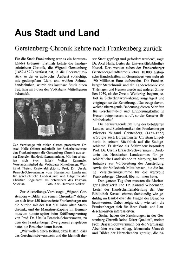 Die herausragende Stellung der bebilderten Landes- und Stadtchroniken des Frankenberger Priesters Wigand Gerstenberg (1457-1522) würdigte auch Bürgermeister Christian Engelhardt in seinem Rückblick auf die Stadtgeschichte. Er dankte als Schirmherr besonders Prof. Dr. Ursula Braasch-Schwersmann, Direktorin des Hessischen Landesamtes für geschichtliche Landeskunde in Marburg, für ihre Initiative zur Vorbereitung der Ausstellung, sowie der Volksbank Mittelhessen, die die hohe Versicherungssumme für die wertvolle Frankenberger Chronik übernommen hatte.