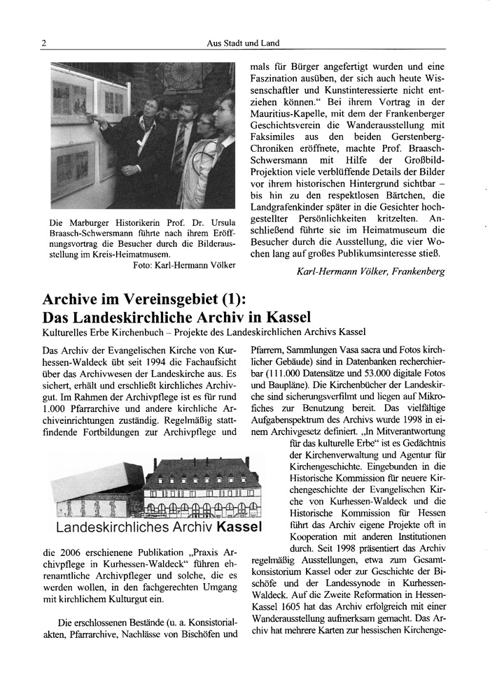 damals für Bürger angefertigt wurden und eine Faszination ausüben, der sich auch heute Wissenschaftler und Kunstinteressierte nicht entziehen können." Bei ihrem Vortrag in der Mauritius-Kapelle, mit dem der Frankenberger Geschichtsverein die Wanderausstellung mit Faksimiles aus den beiden Gerstenberg-Chroniken eröffnete, machte Prof. Braasch-Schwersmann mit Hilfe der Großbild-Projektion viele verblüffende Details der Bilder vor ihrem historischen Hintergrund sichtbar - bis hin zu den respektlosen Bärtchen, die Landgrafenkinder später in die Gesichter hochgestellter Persönlichkeiten kritzelten. Anschließend führte sie im Heimatmuseum die Besucher durch die Ausstellung, die vier Wochen lang auf großes Publikumsinteresse stieß.