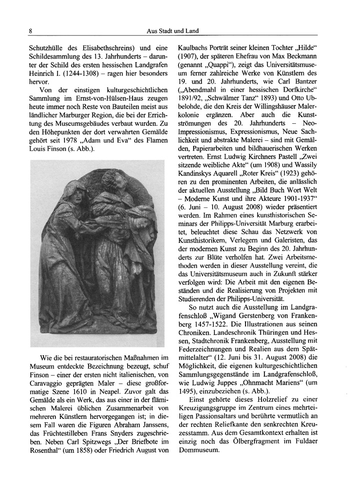 So nutzt auch die Ausstellung im Landgrafenschloß „Wigand Gerstenberg von Frankenberg 1457-1522. Die Illustrationen aus seinen Chroniken. Landeschronik Thüringen und Hessen, Stadtchronik Frankenberg, Ausstellung mit Federzeichnungen und Realien aus dem Spätmittelalter" (12. Juni bis 31. August 2008) die Möglichkeit, die eigenen kulturgeschichtlichen Sammlungsgegenstände im Landgrafenschloß, wie Ludwig Juppes „Ohnmacht Mariens" (um 1495), einzubeziehen (s. Abb.).