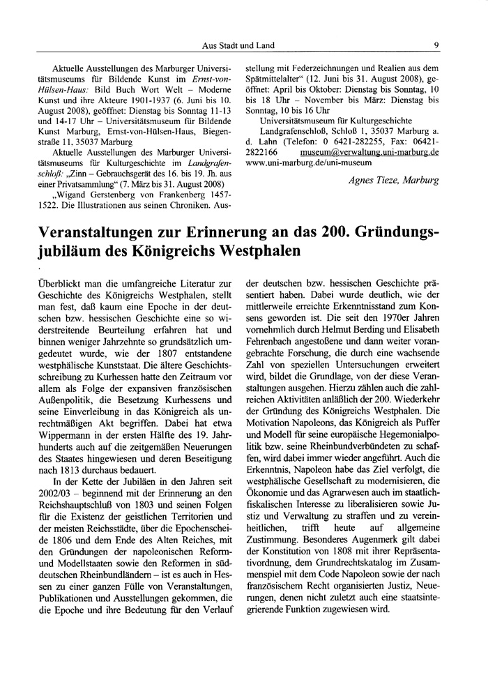 der deutschen bzw. hessischen Geschichte präsentiert haben. Dabei wurde deutlich, wie der mittlerweile erreichte Erkenntnisstand zum Konsens geworden ist. Die seit den 1970er Jahren vornehmlich durch Helmut Berding und Elisabeth Fehrenbach angestoßene und dann weiter vorangebrachte Forschung, die durch eine wachsende Zahl von speziellen Untersuchungen erweitert wird, bildet die Grundlage, von der diese Veranstaltungen ausgehen. Hierzu zählen auch die zahlreichen Aktivitäten anläßlich der 200. Wiederkehr der Gründung des Königreichs Westphalen. Die Motivation Napoleons, das Königreich als Puffer und Modell für seine europäische Hegemonialpolitik bzw. seine Rheinbundverbündeten zu schaffen, wird dabei immer wieder angeführt. Auch die Erkenntnis, Napoleon habe das Ziel verfolgt, die westphälische Gesellschaft zu modernisieren, die Ökonomie und das Agrarwesen auch im staatlichfiskalischen Interesse zu liberalisieren sowie Justiz und Verwaltung zu straffen und zu vereinheitlichen, trifft heute auf allgemeine Zustimmung. Besonderes Augenmerk gilt dabei der Konstitution von 1808 mit ihrer Repräsentativordnung, dem Grundrechtskatalog im Zusammenspiel mit dem Code Napoleon sowie der nach französischem Recht organisierten Justiz, Neuerungen, denen nicht zuletzt auch eine staatsintegrierende Funktion zugewiesen wird.