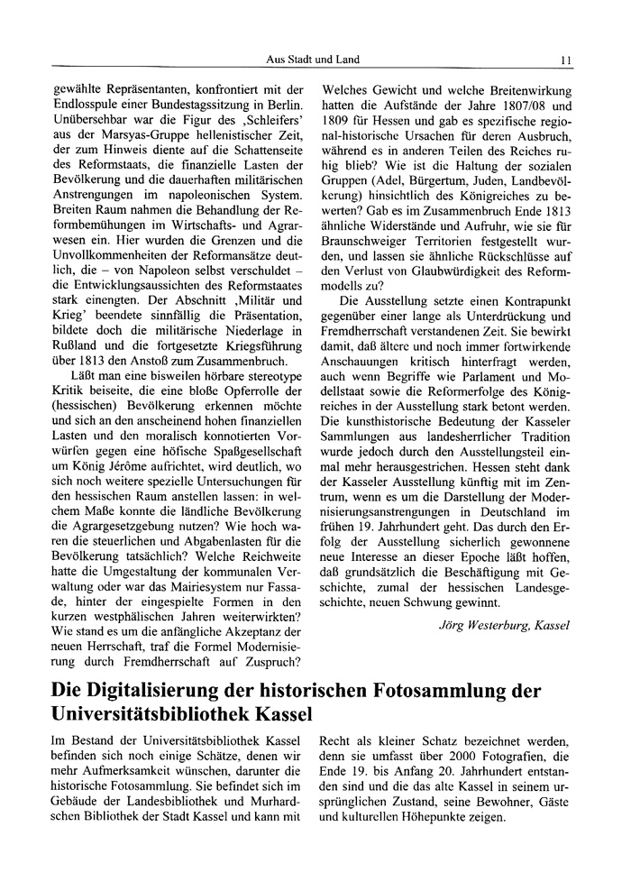 Die Ausstellung setzte einen Kontrapunkt gegenüber einer lange als Unterdrückung und Fremdherrschaft verstandenen Zeit. Sie bewirkt damit, daß ältere und noch immer fortwirkende Anschauungen kritisch hinterfragt werden, auch wenn Begriffe wie Parlament und Modellstaat sowie die Reformerfolge des Königreiches in der Ausstellung stark betont werden. Die kunsthistorische Bedeutung der Kasseler Sammlungen aus landesherrlicher Tradition wurde jedoch durch den Ausstellungsteil einmal mehr herausgestrichen. Hessen steht dank der Kasseler Ausstellung künftig mit im Zentrum, wenn es um die Darstellung der Modernisierungsanstrengungen in Deutschland im frühen 19. Jahrhundert geht. Das durch den Erfolg der Ausstellung sicherlich gewonnene neue Interesse an dieser Epoche läßt hoffen, daß grundsätzlich die Beschäftigung mit Geschichte, zumal der hessischen Landesgeschichte, neuen Schwung gewinnt.