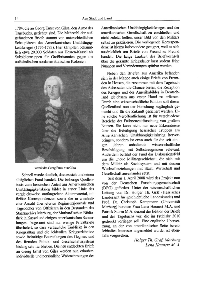 Neben den Briefen aus Amerika befanden sich in der Mappe auch einige Briefe von Freunden in Hessen, die zusammen mit dem Tagebuch des Adressaten die Chance bieten, die Rezeption des Krieges und des Amerikabildes in Deutschland gleichsam aus erster Hand zu erfassen. Durch eine wissenschaftliche Edition soll dieser Quellenfund nun der Forschung zugänglich gemacht und für die Zukunft gesichert werden. Eine solche Veröffentlichung ist für verschiedene Bereiche der Frühneuzeitforschung von großem Nutzen. Sie kann nicht nur neue Erkenntnisse über die Beteiligung hessischer Truppen am Amerikanischen Unabhängigkeitskrieg hervorbringen, sondern ist etwa auch für die seit einigen Jahren anhaltende wissenschaftliche Beschäftigung mit Selbstzeugnissen relevant. Außerdem berührt der Fund das Diskussionsfeld um die „neue Militärgeschichte", die sich mit dem Militär als Sozialsystem und mit dessen Wechselbeziehungen mit Staat, Wirtschaft und Gesellschaft auseinander setzt.