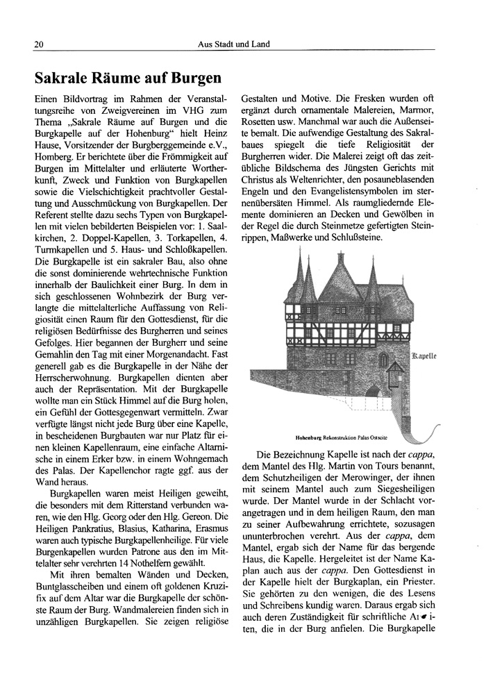 Einen Bildvortrag im Rahmen der Veranstaltungsreihe von Zweigvereinen im VHG zum Thema „Sakrale Räume auf Burgen und die Burgkapelle auf der Hohenburg" hielt Heinz Hause, Vorsitzender der Burgberggemeinde e.V., Homberg. Er berichtete über die Frömmigkeit auf Burgen im Mittelalter und erläuterte Wortherkunft, Zweck und Funktion von Burgkapellen sowie die Vielschichtigkeit prachtvoller Gestaltung und Ausschmückung von Burgkapellen. Der Referent stellte dazu sechs Typen von Burgkapellen mit vielen bebilderten Beispielen vor: 1. Saalkirchen, 2. Doppel-Kapellen, 3. Torkapellen, 4. Turmkapellen und 5. Haus- und Schloßkapellen. Die Burgkapelle ist ein sakraler Bau, also ohne die sonst dominierende wehrtechnische Funktion innerhalb der Baulichkeit einer Burg. In dem in sich geschlossenen Wohnbezirk der Burg verlangte die mittelalterliche Auffassung von Religiosität einen Raum für den Gottesdienst, für die religiösen Bedürfnisse des Burgherren und seines Gefolges. Hier begannen der Burgherr und seine Gemahlin den Tag mit einer Morgenandacht. Fast generell gab es die Burgkapelle in der Nähe der Herrscherwohnung. Burgkapellen dienten aber auch der Repräsentation. Mit der Burgkapelle wollte man ein Stück Himmel auf die Burg holen, ein Gefühl der Gottesgegenwart vermitteln. Zwar verfügte längst nicht jede Burg über eine Kapelle, in bescheidenen Burgbauten war nur Platz für einen kleinen Kapellenraum, eine einfache Altarnische in einem Erker bzw. in einem Wohngemach des Palas. Der Kapellenchor ragte ggf. aus der Wand heraus.