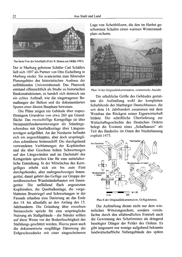 Das letzte Foto des Schafstalls (Foto: R. Brauns aus Müller 1982). Der in Marburg geborene Schüler Carl Schäfers ließ sich 1897 als Partner von Otto Eichelberg in Marburg nieder. Sie avancierten zum führenden Planungsbüro des historistischen Ausbaus der aufblühenden Universitätsstadt. Das Planwerk entstand offensichtlich als Studie zu historischen Baukonstruktionen, es handelt sich dennoch um ein echtes Aufmaß, wie die eingetragenen Bemaßungen der Balken und die dokumentierten Spuren einer älteren Bauphase beweisen.