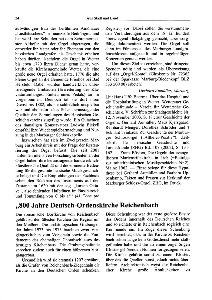 Gerhard Aumüller, Marburg Lit.: Hans Uffe Boerma, Über das Hospital und die Hospitalstiftung in Wetter. Wetteraner Ge schichtsfreunde - Verein für Wettersche Geschichte e. V. Schriften zur Stadtgeschichte Nr. 12, November 2003, S. 18.; zur Geschichte der Orgel s. Gerhard Aumüller, Mads Kjersgaard, Reinhardt Menger, Dorothea Schröder und j' Eckhard Trinkaus: Zur Geschichte der Marburger Schlossorgel („Althefer-Positiv"). Zeitschrift für hessische Geschichte und Landeskunde (ZHG) Bd. 107 (2002), S. 131162. - Franz Bösken, Die Orgeln der evangelischen Marienstiftskirche in Lich (=Beiträge zur mittelrheinischen Musikgeschichte Nr.2). Mainz 1962. - Einzelbelege für diese Hypothese bei Gerhard Aumüller und Barbara Uppenkamp, Fakten und Fragen zur Herkunft der Marburger Schloss-Orgel, ZHG, im Druck.