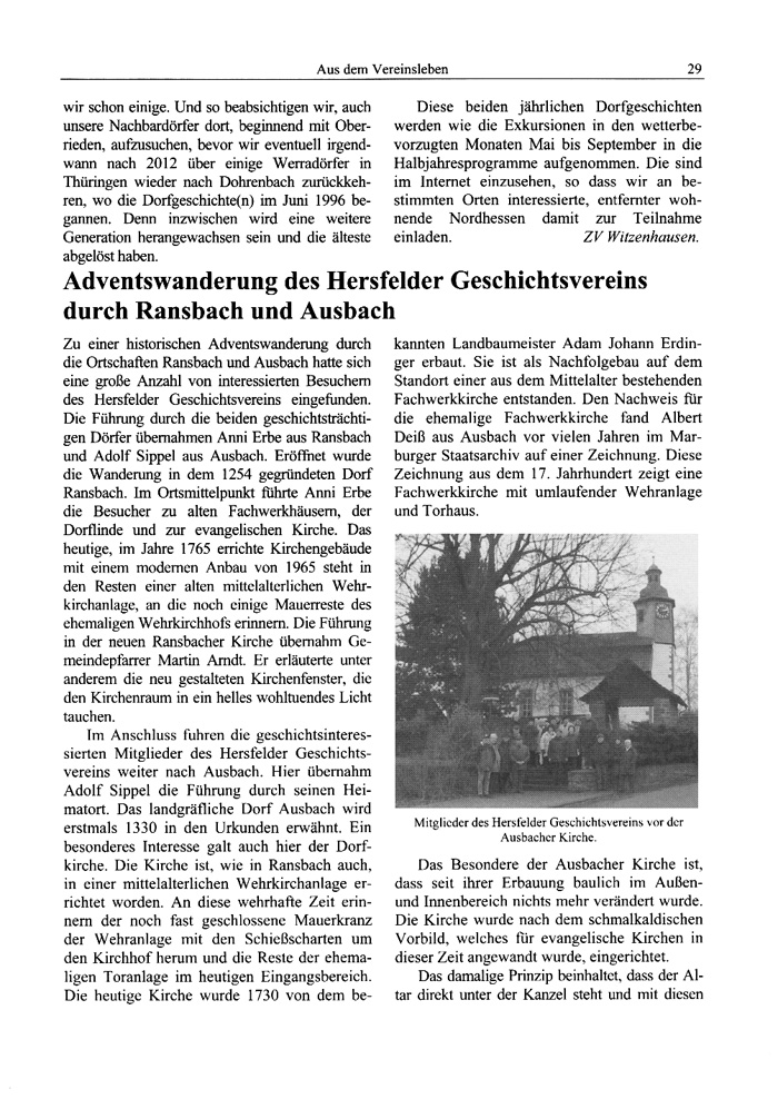 Zu einer historischen Adventswanderung durch die Ortschaften Ransbach und Ausbach hatte sich eine große Anzahl von interessierten Besuchern des Hersfelder Geschichtsvereins eingefunden. Die Führung durch die beiden geschichtsträchtigen Dörfer übernahmen Anni Erbe aus Ransbach und Adolf Sippel aus Ausbach. Eröffnet wurde die Wanderung in dem 1254 gegründeten Dorf Ransbach. Im Ortsmittelpunkt führte Anni Erbe die Besucher zu alten Fachwerkhäusern, der Dorflinde und zur evangelischen Kirche. Das heutige, im Jahre 1765 errichte Kirchengebäude mit einem modernen Anbau von 1965 steht in den Resten einer alten mittelalterlichen Wehrkirchanlage, an die noch einige Mauerreste des ehemaligen Wehrkirchhofs erinnern. Die Führung in der neuen Ransbacher Kirche übernahm Gemeindepfarrer Martin Arndt. Er erläuterte unter anderem die neu gestalteten Kirchenfenster, die den Kirchenraum in ein helles wohltuendes Licht tauchen.