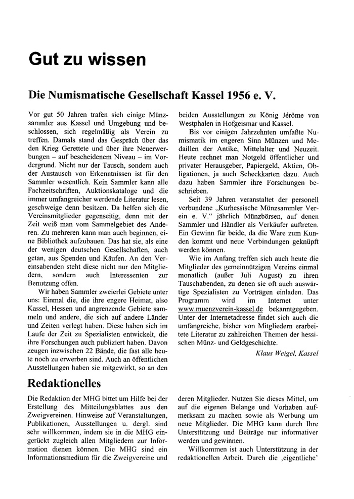 Vor gut 50 Jahren trafen sich einige Münzsammler aus Kassel und Umgebung und beschlossen, sich regelmäßig als Verein zu treffen. Damals stand das Gespräch über das den Krieg Gerettete und über ihre Neuerwerbungen - auf bescheidenem Niveau - im Vordergrund. Nicht nur der Tausch, sondern auch der Austausch von Erkenntnissen ist für den Sammler wesentlich. Kein Sammler kann alle Fachzeitschriften, Auktionskataloge und die immer umfangreicher werdende Literatur lesen, geschweige denn besitzen. Da helfen sich die Vereinsmitglieder gegenseitig, denn mit der Zeit weiß man vom Sammelgebiet des Anderen. Zu mehreren kann man auch beginnen, eine Bibliothek aufzubauen. Das hat sie, als eine der wenigen deutschen Gesellschaften, auch getan, aus Spenden und Käufen. An den Vereinsabenden steht diese nicht nur den Mitgliedern, sondern auch Interessenten zur Benutzung offen.