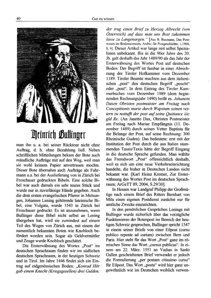 In den persönlichen Gesprächen Lenings mit Bullinger wurde sicherlich über das vorzügliche Funktionieren der Botenpost im Bereich der heutigen Schweiz gesprochen, Bullinger spricht 1547 in einem seiner Briefe von einer Eilpost (cursu publico repente ad curiam) zwischen Bern und Paris. Hier steht für das Wort „Post" ganz im römischen Sinne das Wort „cursus publicus". In einem am 22. März. 1551 an Vadian in Sankt Gallen geschriebenen Brief verwendet er jedoch die Formulierung „per postam citissimo cursu" für Eilpost. Das Wort „posta" wird hier ganz ungewöhnlich wie im Deutschen weiblich verwen-