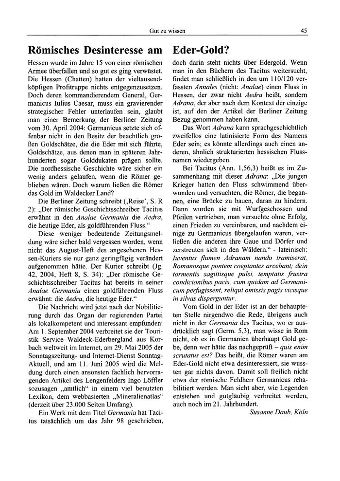 Diese weniger bedeutende Zeitungsmeldung wäre sicher bald vergessen worden, wenn nicht das August-Heft des angesehenen Hessen-Kuriers sie nur ganz geringfügig verändert aufgenommen hätte. Der Kurier schreibt (Jg. 42, 2004, Heft 8, S. 34): „Der römische Geschichtsschreiber Tacitus hat bereits in seiner Analae Germania einen goldführenden Fluss erwähnt: die Aedra, die heutige Eder."