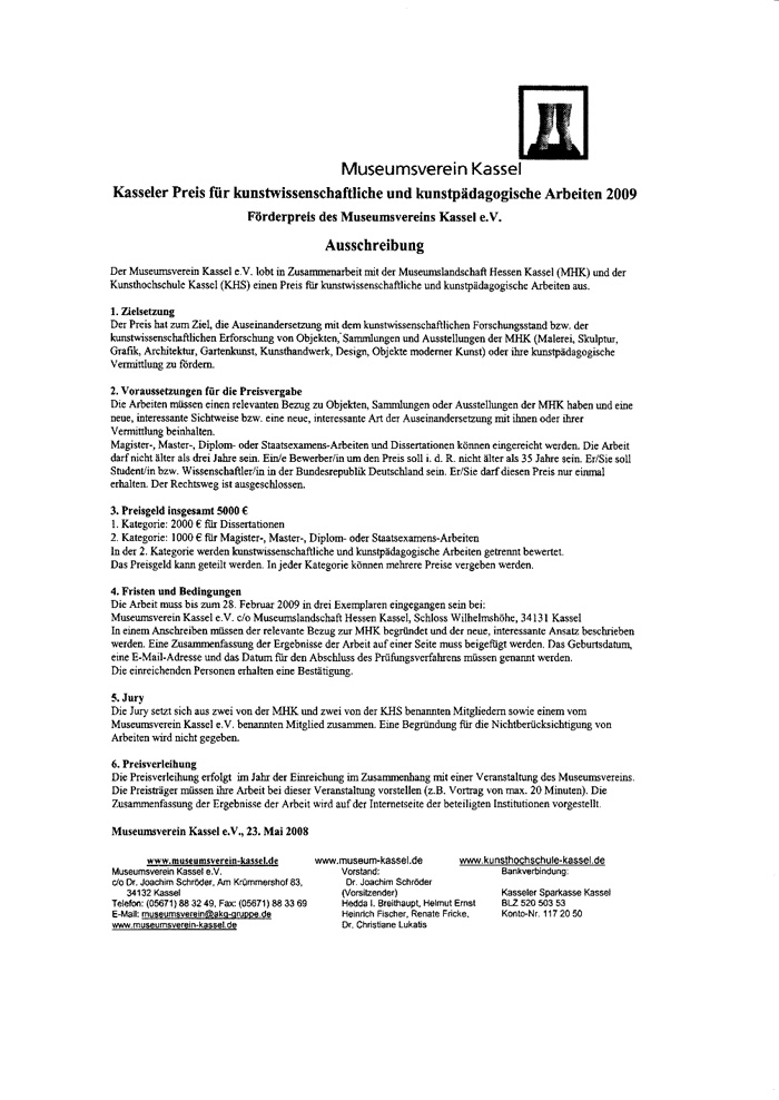 Der Museumsverein Kassel e.V. lobt in Zusammenarbeit mit der Museumslandschaft Hessen Kassel (MHK) und der Kunsthochschule Kassel (KHS) einen Preis fair kunstwissenschaftliche und kunstpädagogische Arbeiten aus.