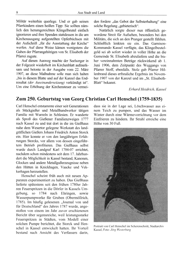 Natürlich sorgte dieser nun öffentlich gewordene Streit für Aufsehen, besonders bei den Militärs, die sich an den Pranger gestellt fühlten. Schließlich lenkten sie ein. Das GarnisonKommando Kassel verfügte, das Klingelbeutelgeld sei ab sofort wieder in voller Höhe an die Gemeinde St. Elisabeth abzuliefern und die bisher vereinnahmten Beträge rückwirkend ab 1. Juni 1906, dem Zeitpunkt des Weggangs von Pfarrer Stoff, ebenfalls. Stolz gab Pfarrer Hillenbrand dieses erfreuliche Ergebnis im November 1907 von der Kanzel und im „St. ElisabethBlatt" bekannt.