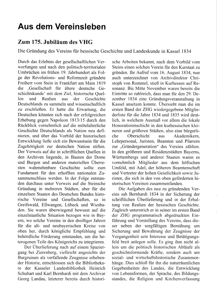 sche Arbeiten bekannt, nach dem Vorbild vom Steins einen solchen Verein für den Kurstaat zu gründen. Ihr Aufruf vom 16. August 1834, nun auch unterzeichnet von Archivdirektor Christoph von Rommel, stieß in Kurhessen auf Resonanz. Bis Mitte November waren bereits die Eintritte so zahlreich, dass man für den 29. Dezember 1834 eine Gründungsveranstaltung in Kassel ansetzen konnte. Übersieht man die im ersten Band der ZHG wiedergegebene Mitgliederliste für die Jahre 1834 und 1835 wird deutlich, in welchem Ausmaß vor allem die lokale Honoratiorenschicht in den kurhessischen kleineren und größeren Städten, also eine bürgerliche Oberschicht aus Akademikern, Lehrpersonal, Juristen, Beamten und Pfarrern zur „Gründergeneration" des Vereins zählten. In den größeren und Residenzstädten Bayerns, Württembergs und anderer Staaten waren es vornehmlich Mitglieder aus dem höfischen Umfeld, mit Adel, der höheren Beamtenschaft und Vertreter der hohen Geistlichkeit sowie Juristen, die sich in den von oben geförderten historischen Vereinen zusammenfanden.