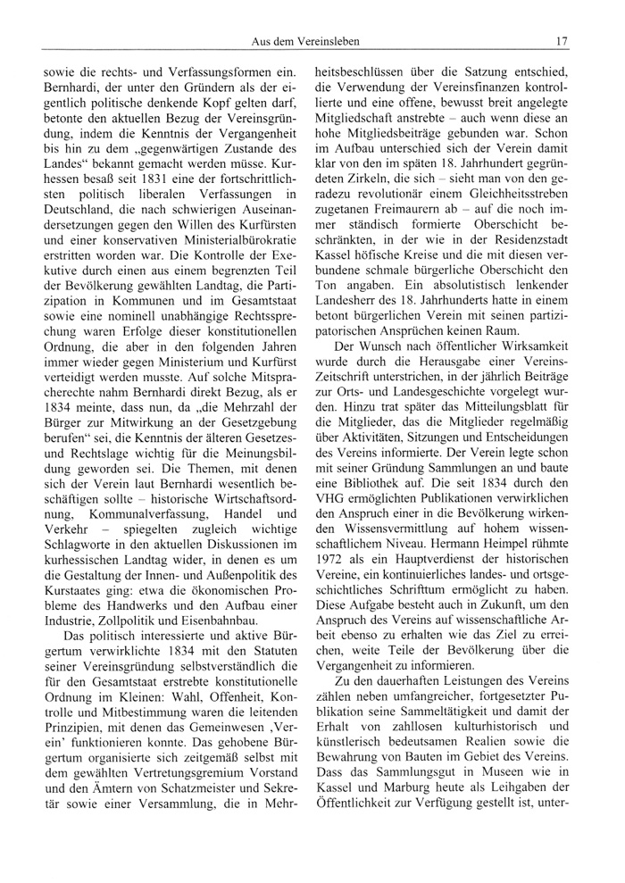 sowie die rechts- und Verfassungsformen ein. Bernhardi, der unter den Gründern als der eigentlich politische denkende Kopf gelten darf, betonte den aktuellen Bezug der Vereinsgründung, indem die Kenntnis der Vergangenheit bis hin zu dem „gegenwärtigen Zustande des Landes" bekannt gemacht werden müsse. Kurhessen besaß seit 1831 eine der fortschrittlichsten politisch liberalen Verfassungen in Deutschland, die nach schwierigen Auseinandersetzungen gegen den Willen des Kurfürsten und einer konservativen Ministerialbürokratie erstritten worden war. Die Kontrolle der Exekutive durch einen aus einem begrenzten Teil der Bevölkerung gewählten Landtag, die Partizipation in Kommunen und im Gesamtstaat sowie eine nominell unabhängige Rechtssprechung waren Erfolge dieser konstitutionellen Ordnung, die aber in den folgenden Jahren immer wieder gegen Ministerium und Kurfürst verteidigt werden musste. Auf solche Mitspracherechte nahm Bernhardi direkt Bezug, als er 1834 meinte, dass nun, da „die Mehrzahl der Bürger zur Mitwirkung an der Gesetzgebung berufen" sei, die Kenntnis der älteren Gesetzesund Rechtslage wichtig für die Meinungsbildung geworden sei. Die Themen, mit denen sich der Verein laut Bernhardi wesentlich beschäftigen sollte - historische Wirtschaftsordnung, Kommunalverfassung, Handel und Verkehr - spiegelten zugleich wichtige Schlagworte in den aktuellen Diskussionen im kurhessischen Landtag wider, in denen es um die Gestaltung der Innen- und Außenpolitik des Kurstaates ging: etwa die ökonomischen Probleme des Handwerks und den Aufbau einer Industrie, Zollpolitik und Eisenbahnbau.