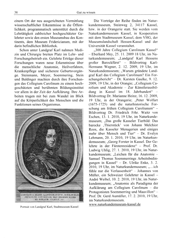 „300 Jahre Collegium Carolinum Kassel" - Eberhard Mey, 25. 11. 2009 18 Uhr, im Naturkundemuseum; „Landgraf Karl Hessens großer Barockfürst" - Bildvortrag KarlHermann Wegner, 2. 12. 2009, 19 Uhr, im Naturkundemuseum; „Warum gründete Landgraf Karl das Collegium Carolinum? Ein Forschungsbericht" - Dr. Karsten Gaulke, 9. 12. 2009, 19 Uhr, in der Orangie; „Collegium Carolium und Akademie - Zur Künstlerausbildung in Kassel im 18. Jahrhundert" - Bildvortrag Dr. Marianne Heinz, 16. 12. 2009, 19 Uhr, in der Orangerie; „Peter Wolfart (1675-1725) und die naturhistorische Forschung am frühen Collegium Caroliunum" - Bildvortrag Dr. Friedrich Frhr. Waitz von Eschen, 13. 1. 2010, 19 Uhr, im Naturkundemuseum; „Das große Kasseler Tierbild: Das barocke Thierstück' von Johann Melchior Roos, die Kasseler Menagerien und einiges mehr über Mensch und Tier" - Dr. Evelyn Lehmann, 20. 1. 2010, 19 Uhr, im Naturkundemuseum; „Georg Forster in Kassel. Der Gelehrte in der Fürstenresidenz" - Prof. Dr. Ludwig Uhlig, 27. 1. 2010, 19 Uhr, im Naturkundemuseum; „Leichen für die Anatomie - Samuel Thomas Soemmerrings Arbeitsbedingungen in Kassel" - Dr. Ulrike Enke, 3. 2. 2010, 19 Uhr, im Naturkundemuseum; „...ich fühle nur die Verlassenheit" - Johannes von Müller, ein Schweizer Gelehrter in Kassel - André Weibel, 10. 2. 2010, 19 Uhr, im Naturkundemuseum; „Anatomie als Paradigma der Aufklärung am Collegium Carolinum - die Protagonisten Soemmerring und Mauvillon" - Prof. Dr. Gerd Aumüller, 17. 2. 2010, 19 Uhr, im Naturkundemuseum. www.naturkundemuseum-kassel.de