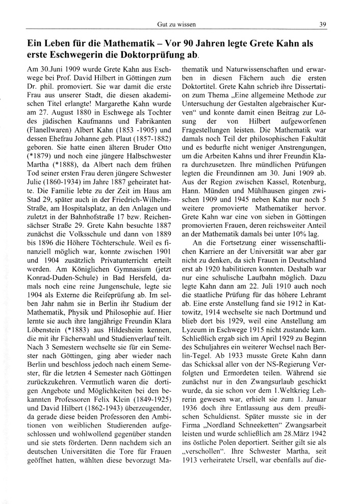 Am 30.Juni 1909 wurde Grete Kahn aus Eschwege bei Prof. David Hilbert in Göttingen zum Dr. phil. promoviert. Sie war damit die erste Frau aus unserer Stadt, die diesen akademischen Titel erlangte! Margarethe Kahn wurde am 27. August 1880 in Eschwege als Tochter des jüdischen Kaufmanns und Fabrikanten (Flanellwaren) Albert Kahn (1853 -1905) und dessen Ehefrau Johanne geh. Plaut (1857-1882) geboren. Sie hatte einen älteren Bruder Otto (*1879) und noch eine jüngere Halbschwester Martha (*1888), da Albert nach dem frühen Tod seiner ersten Frau deren jüngere Schwester Julie (1860-1934) im Jahre 1887 geheiratet hatte. Die Familie lebte zu der Zeit im Haus am Stad 29, später auch in der Friedrich-WilhelmStraße, am Hospitalsplatz, an den Anlagen und zuletzt in der Bahnhofstraße 17 bzw. Reichensächser Straße 29. Grete Kahn besuchte 1887 zunächst die Volksschule und dann von 1889 bis 1896 die Höhere Töchterschule. Weil es finanziell möglich war, konnte zwischen 1901 und 1904 zusätzlich Privatunterricht erteilt werden. Am Königlichen Gymnasium (jetzt Konrad-Duden-Schule) in Bad Hersfeld, damals noch eine reine Jungenschule, legte sie 1904 als Externe die Reifeprüfung ab. Im selben Jahr nahm sie in Berlin ihr Studium der Mathematik, Physik und Philosophie auf. Hier lernte sie auch ihre langjährige Freundin Klara Löbenstein (*1883) aus Hildesheim kennen, die mit ihr Fächerwahl und Studienverlauf teilt. Nach 3 Semestern wechselte sie für ein Semester nach Göttingen, ging aber wieder nach Berlin und beschloss jedoch nach einem Semester, für die letzten 4 Semester nach Göttingen zurückzukehren. Vermutlich waren die dortigen Angebote und Möglichkeiten bei den bekannten Professoren Felix Klein (1849-1925) und David Hilbert (1862-1943) überzeugender, da gerade diese beiden Professoren den Ambitionen von weiblichen Studierenden aufgeschlossen und wohlwollend gegenüber standen und sie stets förderten. Denn nachdem sich an deutschen Universitäten die Tore für Frauen geöffnet hatten, wählten diese bevorzugt Ma