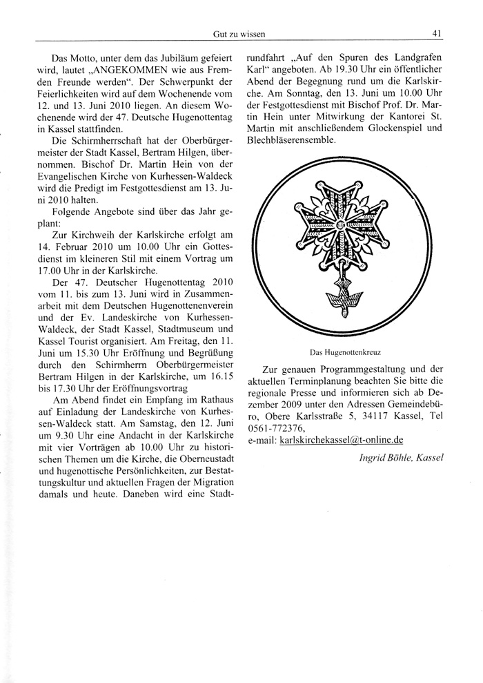 Der 47. Deutscher Hugenottentag 2010 vom 11. bis zum 13. Juni wird in Zusammenarbeit mit dem Deutschen Hugenottenenverein und der Ev. Landeskirche von KurhessenWaldeck, der Stadt Kassel, Stadtmuseum und Kassel Tourist organisiert. Am Freitag, den 11. Juni um 15.30 Uhr Eröffnung und Begrüßung durch den Schirmherrn Oberbürgermeister Bertram Hilgen in der Karlskirche, um 16.15 bis 17.30 Uhr der Eröffnungsvortrag