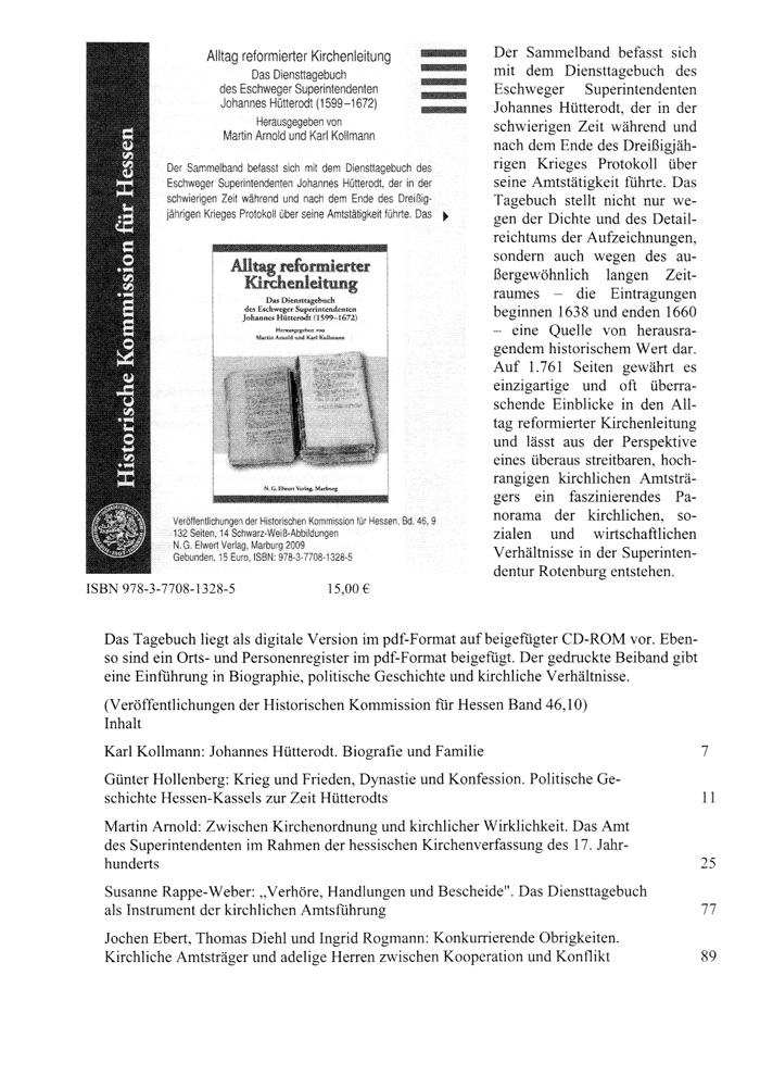 Der Sammelband befasst sich mit dem Diensttagebuch des Eschweger Superintendenten Johannes Hütterodt, der in der schwierigen Zeit während und nach dem Ende des Dreißigjährigen Krieges Protokoll über seine Amtstätigkeit führte. Das Tagebuch stellt nicht nur wegen der Dichte und des Detailreichtums der Aufzeichnungen, sondern auch wegen des außergewöhnlich langen Zeitraumes - die Eintragungen beginnen 1638 und enden 1660 - eine Quelle von herausragendem historischem Wert dar. Auf 1.761 Seiten gewährt es einzigartige und oft überraschende Einblicke in den Alltag reformierter Kirchenleitung und lässt aus der Perspektive eines überaus streitbaren, hochrangigen kirchlichen Amtsträgers ein faszinierendes Panorama der kirchlichen, sozialen und wirtschaftlichen Verhältnisse in der Superintendentur Rotenburg entstehen.