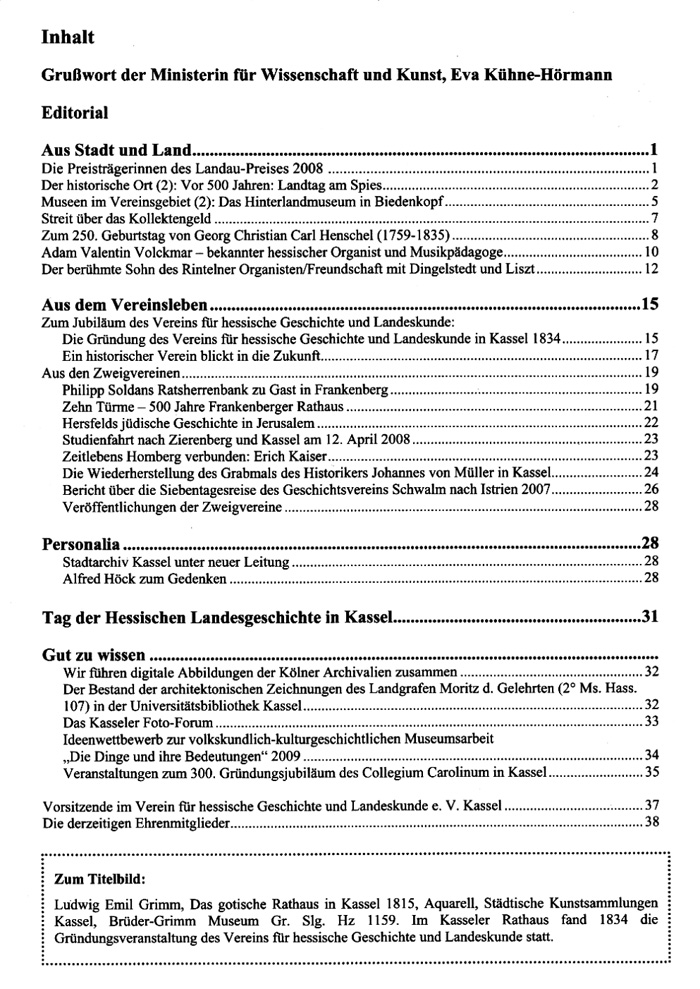 Aus Stadt und Land.........................................................................................................1 Die Preisträgerinnen des Landau-Preises 2008 ....................................................................................1 Der historische Ort (2): Vor 500 Jahren: Landtag am Spies......................................................................... 2 Museen im Vereinsgebiet (2): Das Hinterlandmuseum in Biedenkopf........................................................ 5 Streit über das Kollektengeld ....................................................................................................................... 7 Zum 250. Geburtstag von Georg Christian Carl Henschel (1759-1835) ...................................................... 8 Adam Valentin Volckmar - bekannter hessischer Organist und Musikpädagoge...................................... 10 Der berühmte Sohn des Rintelner Organisten/Freundschaft mit Dingelstedt und Liszt............................. 12 Aus dem Vereinsleben...................................................................................................15 Zum Jubiläum des Vereins für hessische Geschichte und Landeskunde: