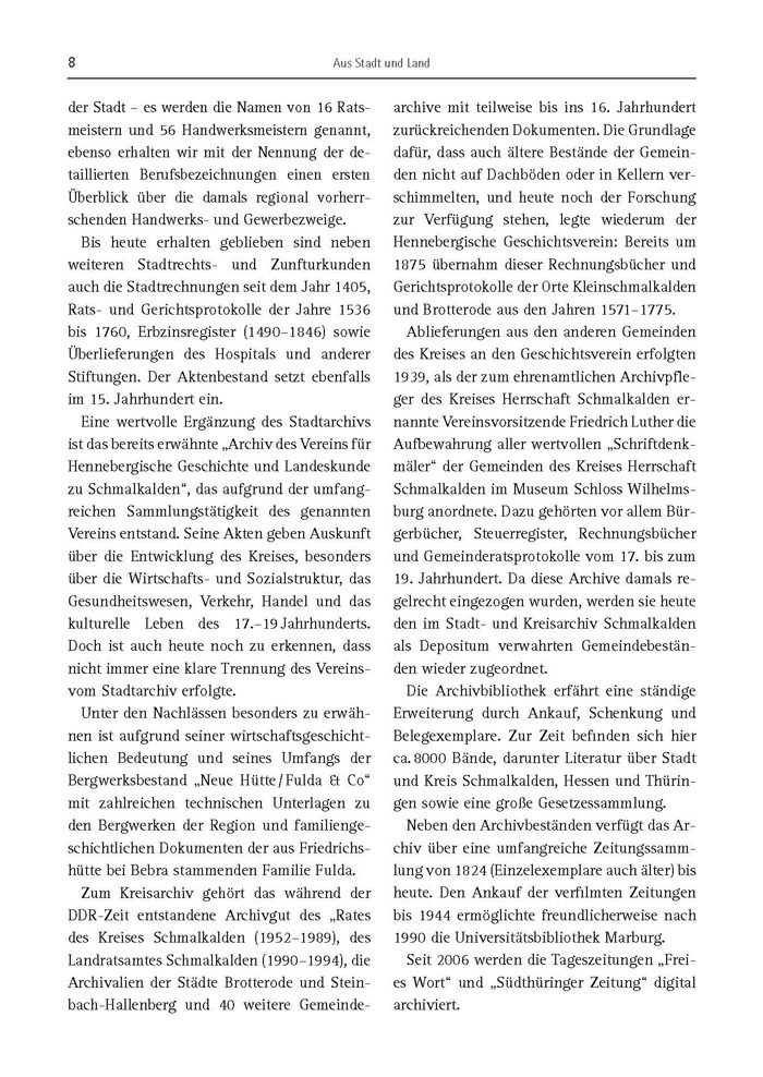 Eine wertvolle Ergänzung des Stadtarchivs ist das bereits erwähnte „Archiv des Vereins für Hennebergische Geschichte und Landeskunde zu Schmalkalden“, das aufgrund der umfangreichen Sammlungstätigkeit des genannten Vereins entstand. Seine Akten geben Auskunft über die Entwicklung des Kreises, besonders über die Wirtschafts- und Sozialstruktur, das Gesundheitswesen, Verkehr, Handel und das kulturelle Leben des 17.–19 Jahrhunderts. Doch ist auch heute noch zu erkennen, dass nicht immer eine klare Trennung des Vereins- vom Stadtarchiv erfolgte.