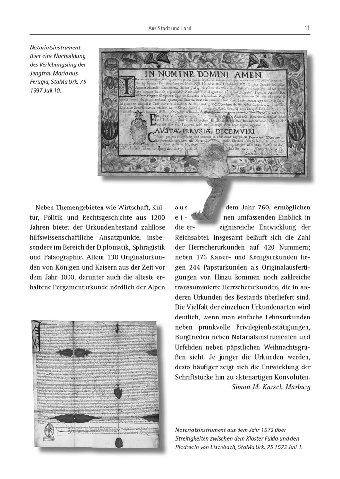 Neben Themengebieten wie Wirtschaft, Kultur, Politik und Rechtsgeschichte aus 1200 Jahren bietet der Urkundenbestand zahllose hilfswissenschaftliche Ansatzpunkte, insbesondere im Bereich der Diplomatik, Sphragistik und Paläographie. Allein 130 Originalurkunden von Königen und Kaisern aus der Zeit vor dem Jahr 1000, darunter auch die älteste erhaltene Pergamenturkunde nördlich der Alpen aus dem Jahr 760, ermöglichen einen umfassenden Einblick in die ereignisreiche Entwicklung der Reichsabtei. Insgesamt beläuft sich die Zahl der Herrscherurkunden auf 420 Nummern; neben 176 Kaiser- und Königsurkunden liegen 244 Papsturkunden als Originalausfertigungen vor. Hinzu kommen noch zahlreiche transsummierte Herrscherurkunden, die in anderen Urkunden des Bestands überliefert sind. Die Vielfalt der einzelnen Urkundenarten wird deutlich, wenn man einfache Lehnsurkunden neben prunkvolle Privilegienbestätigungen, Burgfrieden neben Notariatsinstrumenten und Urfehden neben päpstlichen Weihnachtsgrüßen sieht. Je jünger die Urkunden werden, desto häufiger zeigt sich die Entwicklung der Schriftstücke hin zu aktenartigen Konvoluten.
