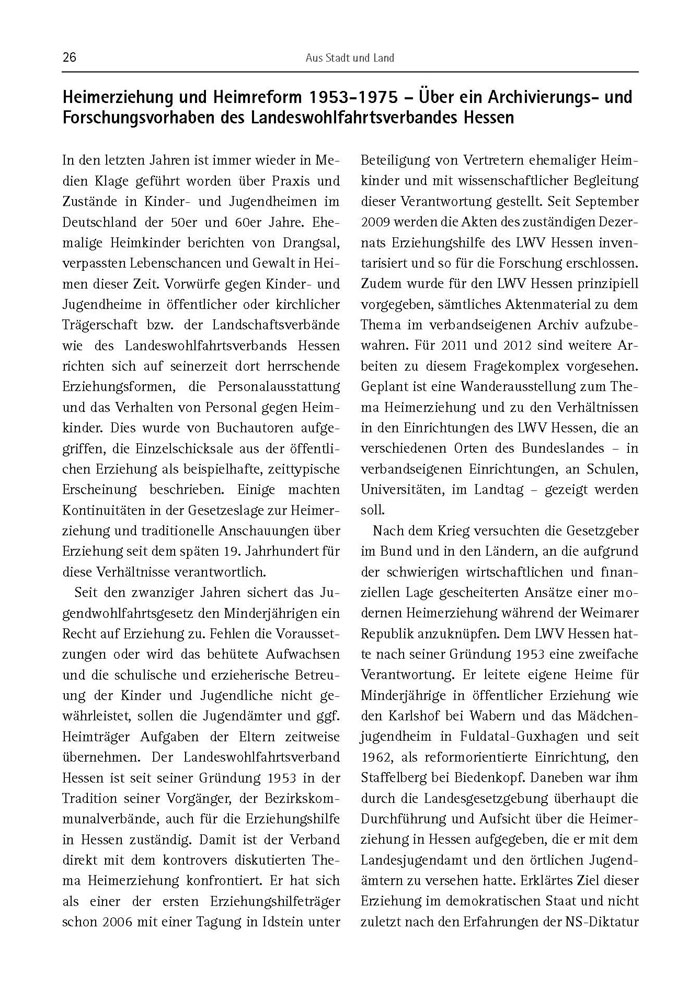 Seit den zwanziger Jahren sichert das Jugendwohlfahrtsgesetz den Minderjährigen ein Recht auf Erziehung zu. Fehlen die Voraussetzungen oder wird das behütete Aufwachsen und die schulische und erzieherische Betreuung der Kinder und Jugendliche nicht gewährleistet, sollen die Jugendämter und ggf. Heimträger Aufgaben der Eltern zeitweise übernehmen. Der Landeswohlfahrtsverband Hessen ist seit seiner Gründung 1953 in der Tradition seiner Vorgänger, der Bezirkskommunalverbände, auch für die Erziehungshilfe in Hessen zuständig. Damit ist der Verband direkt mit dem kontrovers diskutierten Thema Heimerziehung konfrontiert. Er hat sich als einer der ersten Erziehungshilfeträger schon 2006 mit einer Tagung in Idstein unter Beteiligung von Vertretern ehemaliger Heimkinder und mit wissenschaftlicher Begleitung dieser Verantwortung gestellt. Seit September 2009 werden die Akten des zuständigen Dezernats Erziehungshilfe des LWV Hessen inventarisiert und so für die Forschung erschlossen. Zudem wurde für den LWV Hessen prinzipiell vorgegeben, sämtliches Aktenmaterial zu dem Thema im verbandseigenen Archiv aufzubewahren. Für 2011 und 2012 sind weitere Arbeiten zu diesem Fragekomplex vorgesehen. Geplant ist eine Wanderausstellung zum Thema Heimerziehung und zu den Verhältnissen in den Einrichtungen des LWV Hessen, die an verschiedenen Orten des Bundeslandes – in verbandseigenen Einrichtungen, an Schulen, Universitäten, im Landtag – gezeigt werden soll.