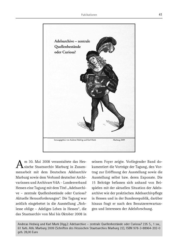 Andreas Hedwig und Karl Murk (Hgg.): Adelsarchive – zentrale Quellenbestände oder Curiosa? 235 S., 1 sw., 61 farb. Abb. Marburg 2009 (Schriften des Hessischen Staatsarchivs Marburg 22), ISBN 978-3-88964-202-0 geb. 28,00 Euro