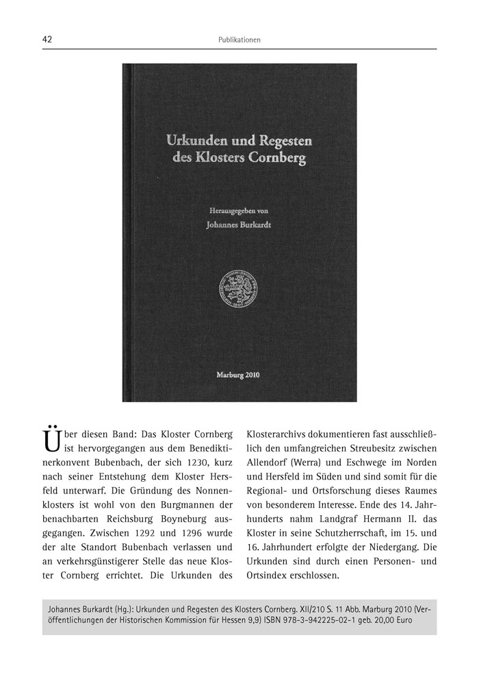 Johannes Burkardt (Hg.): Urkunden und Regesten des Klosters Cornberg. XII/210 S. 11 Abb. Marburg 2010 (Veröffentlichungen der Historischen Kommission für Hessen 9,9) ISBN 978-3-942225-02-1 geb. 20,00 Euro