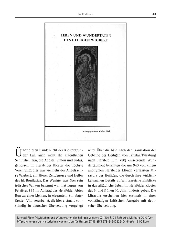Michael Fleck (Hg.): Leben und Wundertaten des heiligen Wigbert. XII/201 S. 22 farb. Abb. Marburg 2010 (Veröffentlichungen der Historischen Kommission für Hessen 67,4) ISBN 978-3-942225-04-5 geb. 16,00 Euro