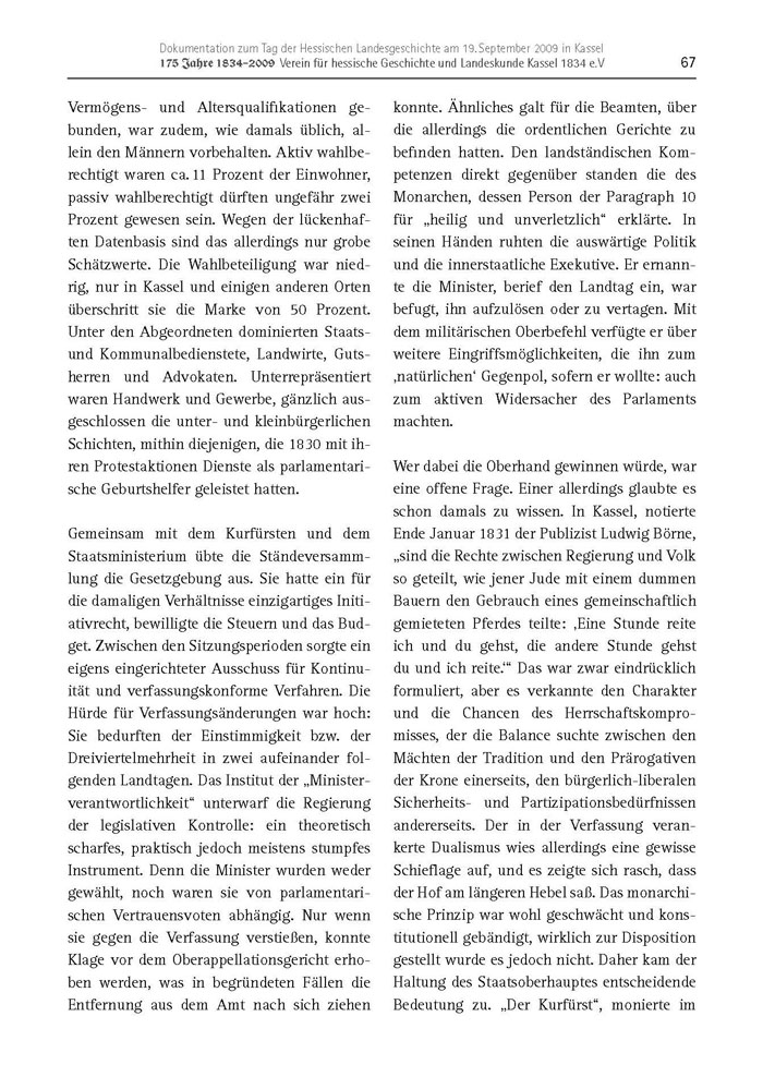 Vermögens- und Altersqualifikationen gebunden, war zudem, wie damals üblich, allein den Männern vorbehalten. Aktiv wahlberechtigt waren ca. 11 Prozent der Einwohner, passiv wahlberechtigt dürften ungefähr zwei Prozent gewesen sein. Wegen der lückenhaften Datenbasis sind das allerdings nur grobe Schätzwerte. Die Wahlbeteiligung war niedrig, nur in Kassel und einigen anderen Orten überschritt sie die Marke von 50 Prozent. Unter den Abgeordneten dominierten Staats- und Kommunalbedienstete, Landwirte, Gutsherren und Advokaten. Unterrepräsentiert waren Handwerk und Gewerbe, gänzlich ausgeschlossen die unter- und kleinbürgerlichen Schichten, mithin diejenigen, die 1830 mit ihren Protestaktionen Dienste als parlamentari-sche Geburtshelfer geleistet hatten.