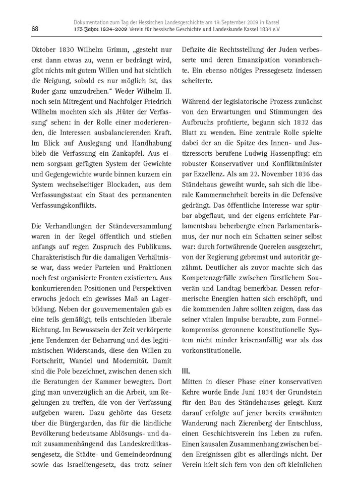 Oktober 1830 Wilhelm Grimm, „gesteht nur erst dann etwas zu, wenn er bedrängt wird, gibt nichts mit gutem Willen und hat sichtlich die Neigung, sobald es nur möglich ist, das Ruder ganz umzudrehen.“ Weder Wilhelm II. noch sein Mitregent und Nachfolger Friedrich Wilhelm mochten sich als ‚Hüter der Verfassung‘ sehen: in der Rolle einer moderierenden, die Interessen ausbalancierenden Kraft. Im Blick auf Auslegung und Handhabung blieb die Verfassung ein Zankapfel. Aus einem sorgsam gefügten System der Gewichte und Gegengewichte wurde binnen kurzem ein System wechselseitiger Blockaden, aus dem Verfassungsstaat ein Staat des permanenten Verfassungskonflikts.