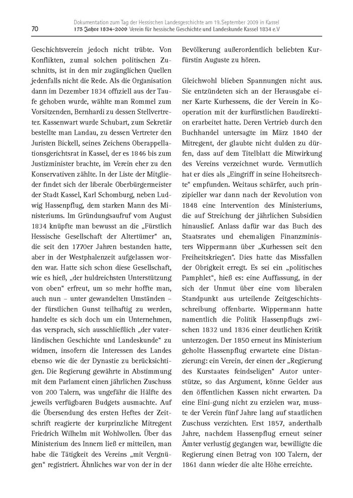 Geschichtsverein jedoch nicht trübte. Von Konflikten, zumal solchen politischen Zuschnitts, ist in den mir zugänglichen Quellen jedenfalls nicht die Rede. Als die Organisation dann im Dezember 1834 offiziell aus der Taufe gehoben wurde, wählte man Rommel zum Vorsitzenden, Bernhardi zu dessen Stellvertreter. Kassenwart wurde Schubart, zum Sekretär bestellte man Landau, zu dessen Vertreter den Juristen Bickell, seines Zeichens Oberappellationsgerichtsrat in Kassel, der es 1846 bis zum Justizminister brachte, im Verein eher zu den Konservativen zählte. In der Liste der Mitglie-der findet sich der liberale Oberbürgermeister der Stadt Kassel, Karl Schomburg, neben Ludwig Hassenpflug, dem starken Mann des Ministeriums. Im Gründungsaufruf vom August 1834 knüpfte man bewusst an die „Fürstlich Hessische Gesellschaft der Altertümer“ an, die seit den 1770er Jahren bestanden hatte, aber in der Westphalenzeit aufgelassen worden war. Hatte sich schon diese Gesellschaft, wie es hieß, „der huldreichsten Unterstützung von oben“ erfreut, um so mehr hoffte man, auch nun – unter gewandelten Umständen – der fürstlichen Gunst teilhaftig zu werden, handelte es sich doch um ein Unternehmen, das versprach, sich ausschließlich „der vaterländischen Geschichte und Landeskunde“ zu widmen, insofern die Interessen des Landes ebenso wie die der Dynastie zu berücksichtigen. Die Regierung gewährte in Abstimmung mit dem Parlament einen jährlichen Zuschuss von 200 Talern, was ungefähr die Hälfte des jeweils verfügbaren Budgets ausmachte. Auf die Übersendung des ersten Heftes der Zeitschrift reagierte der kurprinzliche Mitregent Friedrich Wilhelm mit Wohlwollen. Über das Ministerium des Innern ließ er mitteilen, man habe die Tätigkeit des Vereins „mit Vergnügen“ registriert. Ähnliches war von der in der Bevölkerung außerordentlich beliebten Kurfürstin Auguste zu hören.