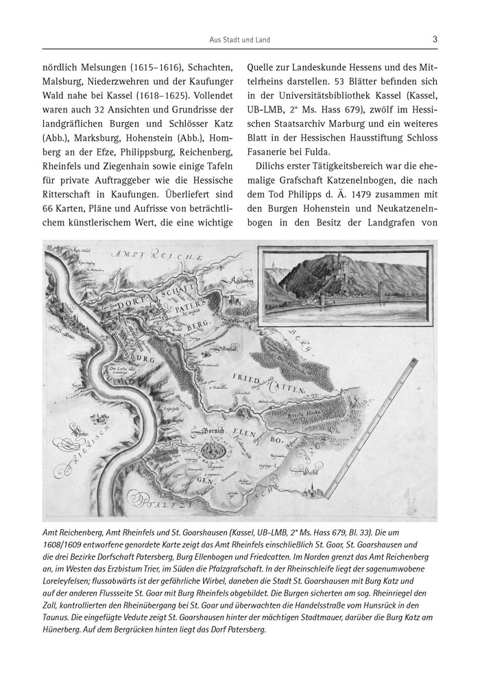 Amt Reichenberg, Amt Rheinfels und St. Goarshausen (Kassel, UB-LMB, 2° Ms. Hass 679, Bl. 33). Die um 1608/1609 entworfene genordete Karte zeigt das Amt Rheinfels einschließlich St. Goar, St. Goarshausen und die drei Bezirke Dorfschaft Patersberg, Burg Ellenbogen und Friedcatten. Im Norden grenzt das Amt Reichenberg an, im Westen das Erzbistum Trier, im Süden die Pfalzgrafschaft. In der Rheinschleife liegt der sagenumwobene Loreleyfelsen; flussabwärts ist der gefährliche Wirbel, daneben die Stadt St. Goarshausen mit Burg Katz und auf der anderen Flussseite St. Goar mit Burg Rheinfels abgebildet. Die Burgen sicherten am sog. Rheinriegel den Zoll, kontrollierten den Rheinübergang bei St. Goar und überwachten die Handelsstraße vom Hunsrück in den Taunus. Die eingefügte Vedute zeigt St. Goarshausen hinter der mächtigen Stadtmauer, darüber die Burg Katz am Hünerberg. Auf dem Bergrücken hinten liegt das Dorf Patersberg.