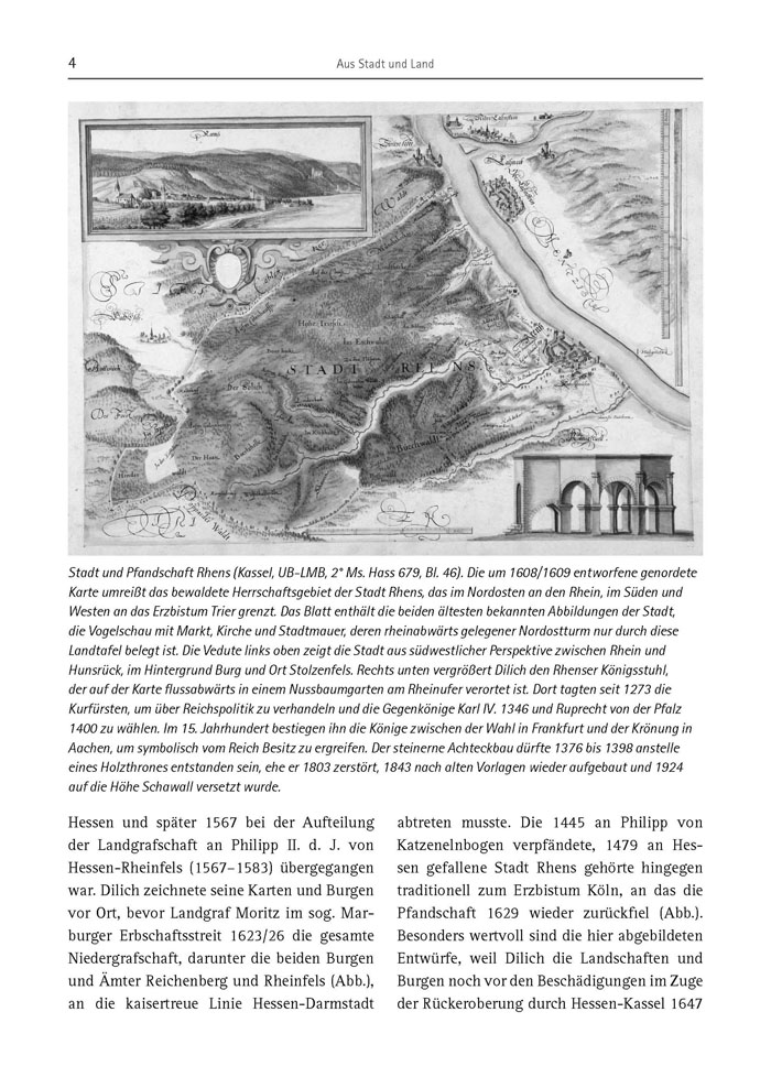 Hessen und später 1567 bei der Aufteilung der Landgrafschaft an Philipp II. d. J. von Hessen-Rheinfels (1567–1583) übergegangen war. Dilich zeichnete seine Karten und Burgen vor Ort, bevor Landgraf Moritz im sog. Marburger Erbschaftsstreit 1623/26 die gesamte Niedergrafschaft, darunter die beiden Burgen und Ämter Reichenberg und Rheinfels (Abb.), an die kaisertreue Linie Hessen-Darmstadt abtreten musste. Die 1445 an Philipp von Katzenelnbogen verpfändete, 1479 an Hessen gefallene Stadt Rhens gehörte hingegen traditionell zum Erzbistum Köln, an das die Pfandschaft 1629 wieder zurückfiel (Abb.). Besonders wertvoll sind die hier abgebildeten Entwürfe, weil Dilich die Landschaften und Burgen noch vor den Beschädigungen im Zuge der Rückeroberung durch Hessen-Kassel 1647