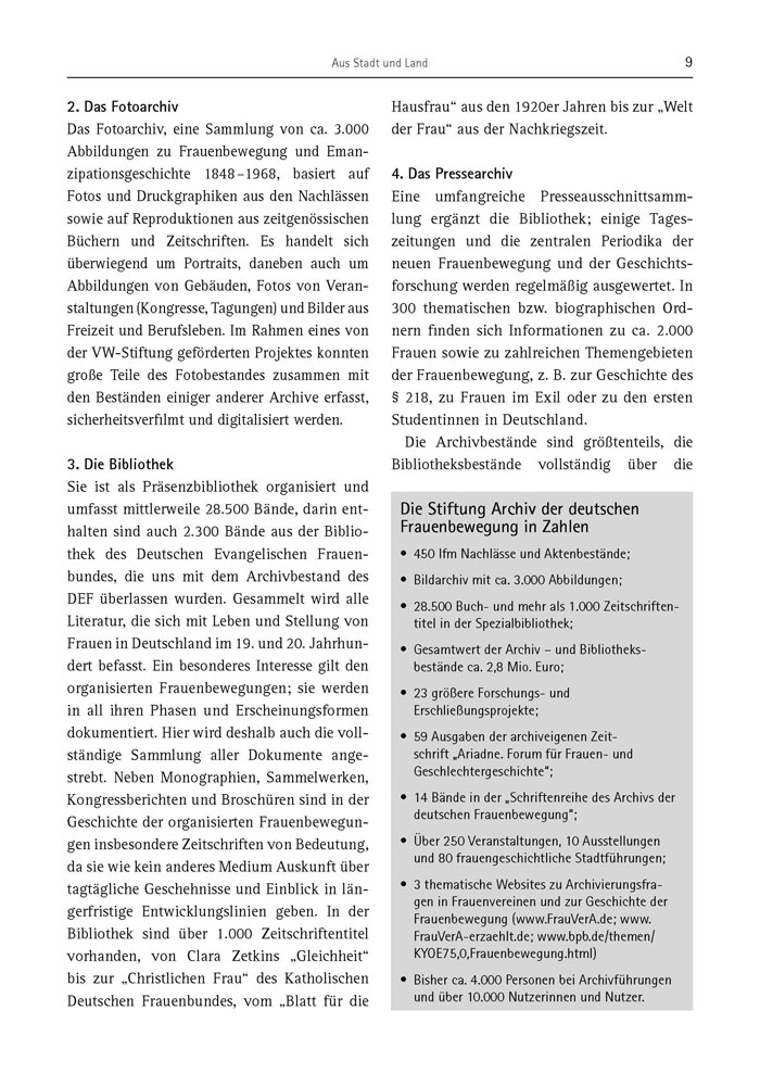 • 3 thematische Websites zu Archivierungsfragen in Frauenvereinen und zur Geschichte der Frauenbewegung (www.FrauVerA.de; www.FrauVerA-erzaehlt.de; www.bpb.de/themen/KYOE75,0,Frauenbewegung.html)