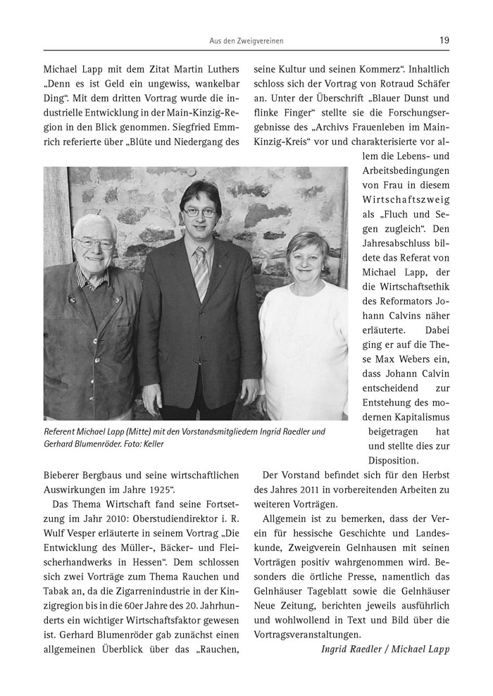 Das Thema Wirtschaft fand seine Fortsetzung im Jahr 2010: Oberstudiendirektor i. R. Wulf Vesper erläuterte in seinem Vortrag „Die Entwicklung des Müller-, Bäcker- und Fleischerhandwerks in Hessen“. Dem schlossen sich zwei Vorträge zum Thema Rauchen und Tabak an, da die Zigarrenindustrie in der Kinzigregion bis in die 60er Jahre des 20. Jahrhunderts ein wichtiger Wirtschaftsfaktor gewesen ist. Gerhard Blumenröder gab zunächst einen allgemeinen Überblick über das „Rauchen, seine Kultur und seinen Kommerz“. Inhaltlich schloss sich der Vortrag von Rotraud Schäfer an. Unter der Überschrift „Blauer Dunst und flinke Finger“ stellte sie die Forschungsergebnisse des „Archivs Frauenleben im Main-Kinzig-Kreis“ vor und charakterisierte vor allem die Lebens- und Arbeitsbedingungen von Frau in diesem Wirtschaftszweig als „Fluch und Segen zugleich“. Den Jahresabschluss bildete das Referat von Michael Lapp, der die Wirtschaftsethik des Reformators Johann Calvins näher erläuterte. Dabei ging er auf die These Max Webers ein, dass Johann Calvin entscheidend zur Entstehung des modernen Kapitalismus beigetragen hat und stellte dies zur Disposition.