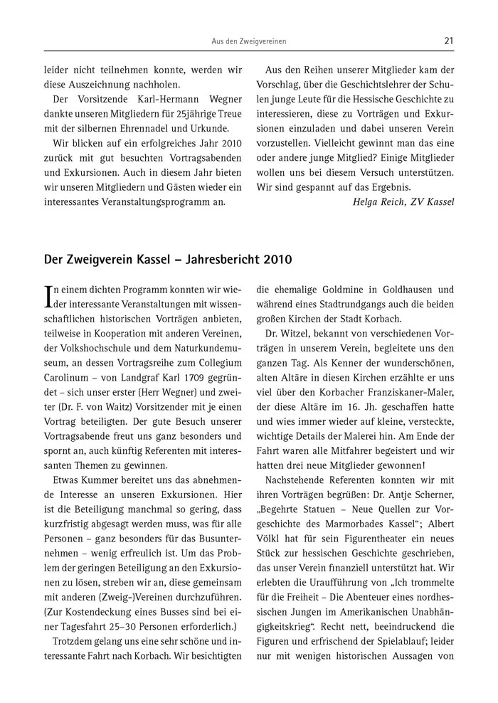 In einem dichten Programm konnten wir wieder interessante Veranstaltungen mit wissenschaftlichen historischen Vorträgen anbieten, teilweise in Kooperation mit anderen Vereinen, der Volkshochschule und dem Naturkundemuseum, an dessen Vortragsreihe zum Collegium Carolinum – von Landgraf Karl 1709 gegründet – sich unser erster (Herr Wegner) und zweiter (Dr. F. von Waitz) Vorsitzender mit je einen Vortrag beteiligten. Der gute Besuch unserer Vortragsabende freut uns ganz besonders und spornt an, auch künftig Referenten mit interessanten Themen zu gewinnen.