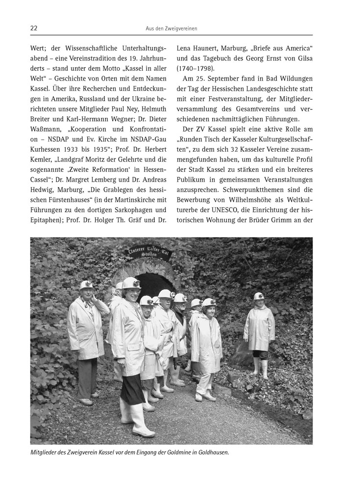 Wert; der Wissenschaftliche Unterhaltungsabend – eine Vereinstradition des 19. Jahrhunderts – stand unter dem Motto „Kassel in aller Welt“ – Geschichte von Orten mit dem Namen Kassel. Über ihre Recherchen und Entdeckungen in Amerika, Russland und der Ukraine berichteten unsere Mitglieder Paul Ney, Helmuth Breiter und Karl-Hermann Wegner; Dr. Dieter Waßmann, „Kooperation und Konfrontation – NSDAP und Ev. Kirche im NSDAP-Gau Kurhessen 1933 bis 1935“; Prof. Dr. Herbert Kemler, „Landgraf Moritz der Gelehrte und die sogenannte ‚Zweite Reformation‘ in Hessen-Cassel“; Dr. Margret Lemberg und Dr. Andreas Hedwig, Marburg, „Die Grablegen des hessischen Fürstenhauses“ (in der Martinskirche mit Führungen zu den dortigen Sarkophagen und Epitaphen); Prof. Dr. Holger Th. Gräf und Dr. Lena Haunert, Marburg, „Briefe aus America“ und das Tagebuch des Georg Ernst von Gilsa (1740–1798).