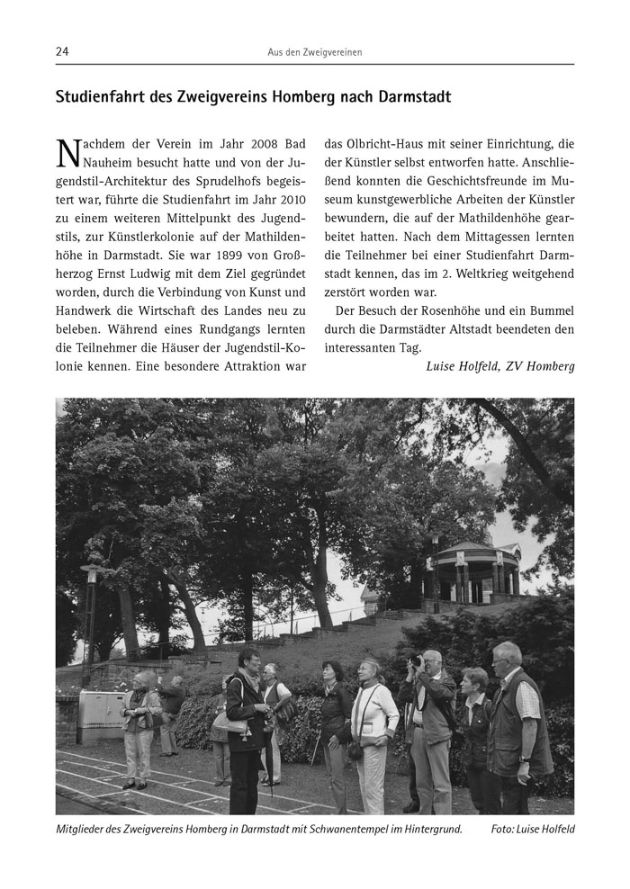 Nachdem der Verein im Jahr 2008 Bad Nauheim besucht hatte und von der Jugendstil-Architektur des Sprudelhofs begeistert war, führte die Studienfahrt im Jahr 2010 zu einem weiteren Mittelpunkt des Jugendstils, zur Künstlerkolonie auf der Mathildenhöhe in Darmstadt. Sie war 1899 von Großherzog Ernst Ludwig mit dem Ziel gegründet worden, durch die Verbindung von Kunst und Handwerk die Wirtschaft des Landes neu zu beleben. Während eines Rundgangs lernten die Teilnehmer die Häuser der Jugendstil-Kolonie kennen. Eine besondere Attraktion war das Olbricht-Haus mit seiner Einrichtung, die der Künstler selbst entworfen hatte. Anschließend konnten die Geschichtsfreunde im Museum kunstgewerbliche Arbeiten der Künstler bewundern, die auf der Mathildenhöhe gearbeitet hatten. Nach dem Mittagessen lernten die Teilnehmer bei einer Studienfahrt Darmstadt kennen, das im 2. Weltkrieg weitgehend zerstört worden war.