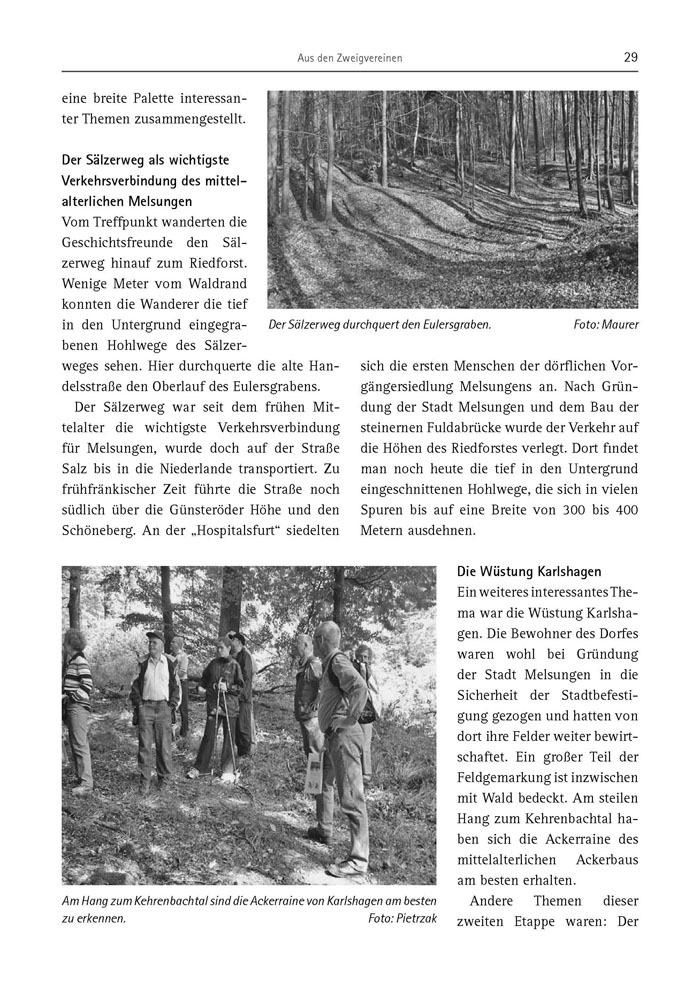Ein weiteres interessantes Thema war die Wüstung Karlshagen. Die Bewohner des Dorfes waren wohl bei Gründung der Stadt Melsungen in die Sicherheit der Stadtbefestigung gezogen und hatten von dort ihre Felder weiter bewirtschaftet. Ein großer Teil der Feldgemarkung ist inzwischen mit Wald bedeckt. Am steilen Hang zum Kehrenbachtal haben sich die Ackerraine des mittelalterlichen Ackerbaus am besten erhalten.
