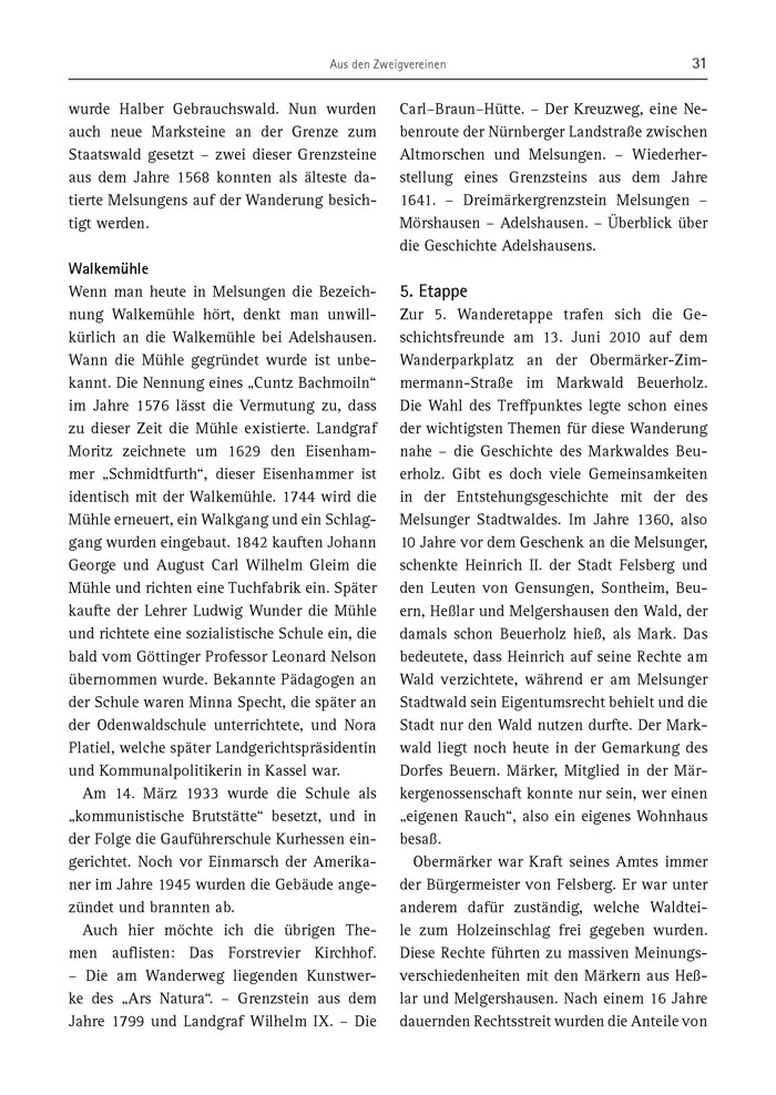 Auch hier möchte ich die übrigen Themen auflisten: Das Forstrevier Kirchhof. – Die am Wanderweg liegenden Kunstwerke des „Ars Natura“. – Grenzstein aus dem Jahre 1799 und Landgraf Wilhelm IX. – Die Carl–Braun–Hütte. – Der Kreuzweg, eine Nebenroute der Nürnberger Landstraße zwischen Altmorschen und Melsungen. – Wiederherstellung eines Grenzsteins aus dem Jahre 1641. – Dreimärkergrenzstein Melsungen – Mörshausen – Adelshausen. – Überblick über die Geschichte Adelshausens.