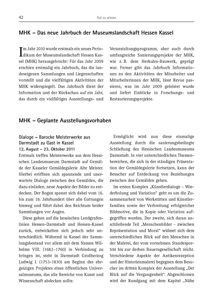 Im Jahr 2010 wurde erstmals ein neues Periodikum der Museumslandschaft Hessen Kassel (MHK) herausgebracht: Für das Jahr 2009 erschien erstmalig ein Jahrbuch, das die landeseigenen Sammlungen und Liegenschaften vorstellt und die vielfältigen Aktivitäten der MHK widerspiegelt. Das Jahrbuch dient der Information und der Rückschau auf ein Jahr, das durch ein vielfältiges Ausstellungs- und Veranstaltungsprogramm, aber auch durch umfangreiche Sanierungsprojekte der MHK, wie z. B. dem Herkules-Bauwerk, geprägt war. Ferner gibt das Jahrbuch Informationen zu den Aktivitäten der Mitarbeiter und Mitarbeiterinnen der MHK, lässt Revue passieren, was im Jahr 2009 geleistet wurde und liefert Einblicke in Forschungs- und Restaurierungsprojekte.