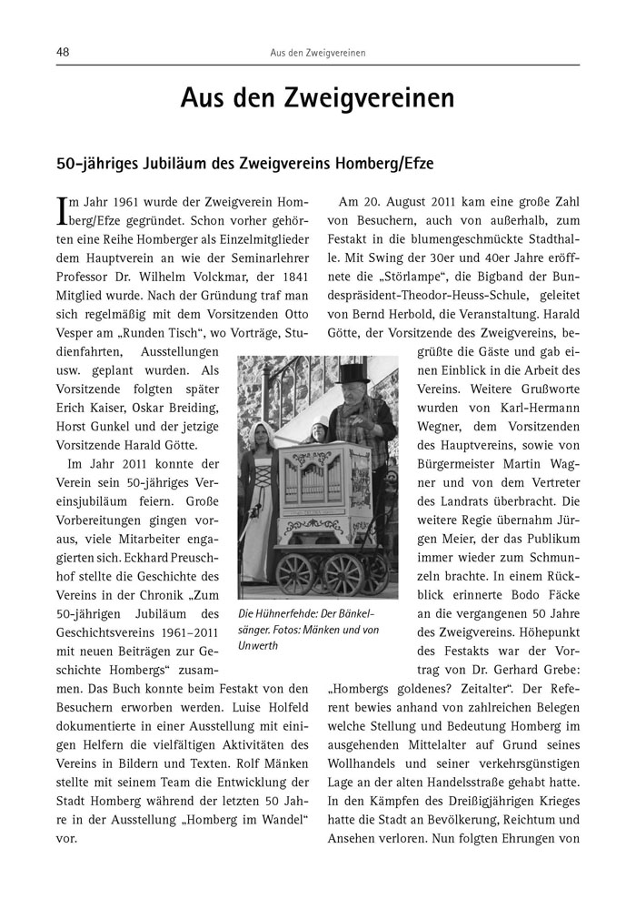 Am 20. August 2011 kam eine große Zahl von Besuchern, auch von außerhalb, zum Festakt in die blumengeschmückte Stadthalle. Mit Swing der 30er und 40er Jahre eröffnete die „Störlampe“, die Bigband der Bundespräsident-Theodor-Heuss-Schule, geleitet von Bernd Herbold, die Veranstaltung. Harald Götte, der Vorsitzende des Zweigvereins, begrüßte die Gäste und gab einen Einblick in die Arbeit des Vereins. Weitere Grußworte wurden von Karl-Hermann Wegner, dem Vorsitzenden des Hauptvereins, sowie von Bürgermeister Martin Wagner und von dem Vertreter des Landrats überbracht. Die weitere Regie übernahm Jürgen Meier, der das Publikum immer wieder zum Schmunzeln brachte. In einem Rückblick erinnerte Bodo Fäcke an die vergangenen 50 Jahre des Zweigvereins. Höhepunkt des Festakts war der Vortrag von Dr. Gerhard Grebe: „Hombergs goldenes? Zeitalter“. Der Referent bewies anhand von zahlreichen Belegen welche Stellung und Bedeutung Homberg im ausgehenden Mittelalter auf Grund seines Wollhandels und seiner verkehrsgünstigen Lage an der alten Handelsstraße gehabt hatte. In den Kämpfen des Dreißigjährigen Krieges hatte die Stadt an Bevölkerung, Reichtum und Ansehen verloren. Nun folgten Ehrungen von
