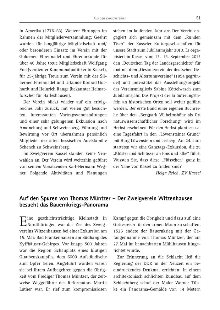 Im Zweigverein Kassel standen keine Neuwahlen an. Der Verein wird weiterhin geführt von seinem Vorsitzenden Karl-Hermann Wegner. Folgende Aktivitäten und Planungen stehen im laufenden Jahr an: Der Verein engagiert sich gemeinsam mit dem „Runden Tisch“ der Kasseler Kulturgesellschaften für unsere Stadt zum Jubiläumsjahr 2013. Er organisiert in Kassel vom 13.–15. September 2013 den „Deutschen Tag der Landesgeschichte“ für und mit dem „Gesamtverein der deutschen Geschichts- und Altertumsvereine“ (1854 gegründet) und unterstützt das Ausstellungsprojekt des Vereinsmitglieds Sabine Köttelwesch zum Jubiläumsjahr. Das Projekt der Erläuterungstafeln an historischen Orten soll weiter geführt werden. Der erste Band einer eigenen Buchreihe über den „Bergpark Wilhelmshöhe als Ort naturwissenschaftlicher Forschung“ wird im Herbst erscheinen. Für den Herbst plant er u. a. eine Tagesfahrt in den „Löwensteiner Grund“ mit Burg Löwenstein und Jesberg. Am 24. Juni starteten wir eine Ganztags-Exkursion, die zu „Klöster und Schlösser an Ems und Elbe“ führt. Wussten Sie, dass diese „Flüsschen“ ganz in der Nähe von Kassel zu finden sind?
